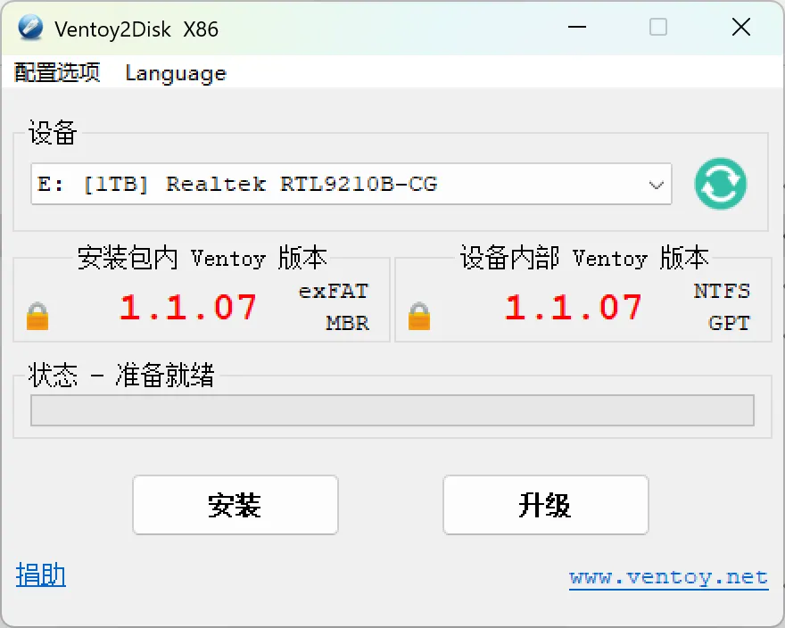 提前插上U盘,解压下载好的Ventoy工具包,双击打开Ventoy2Disk程序,点击安装,按提示操作即可,安装成功后会显示设备内部Ventoy版号,其应与安装包内Ventoy版本号一致。**(注意!!!此操作会清空U盘,请提前备份好U盘内数据**