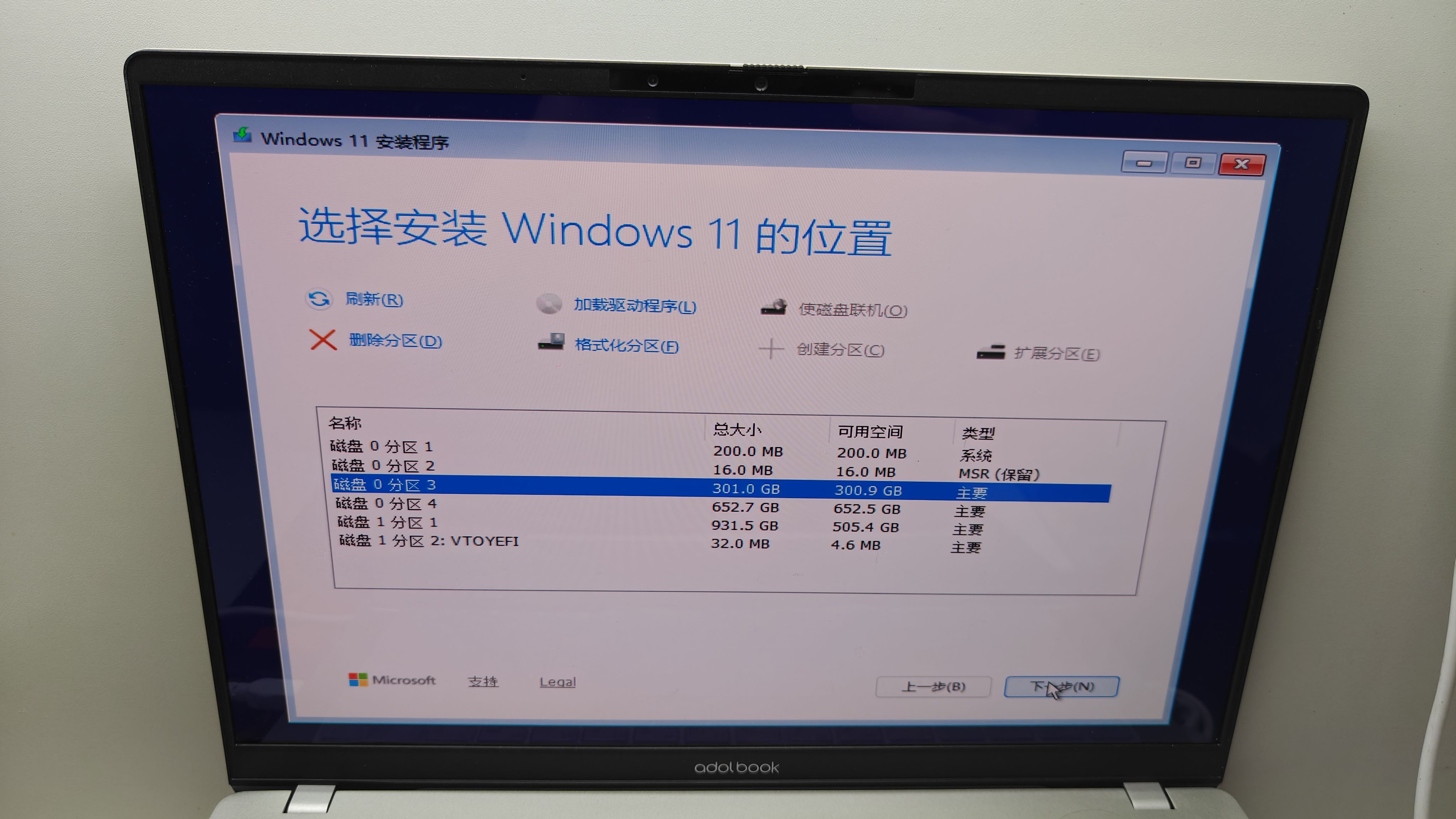 选择300G左右的分区,点击下一步。(此分区在安装完系统后会成为C盘)